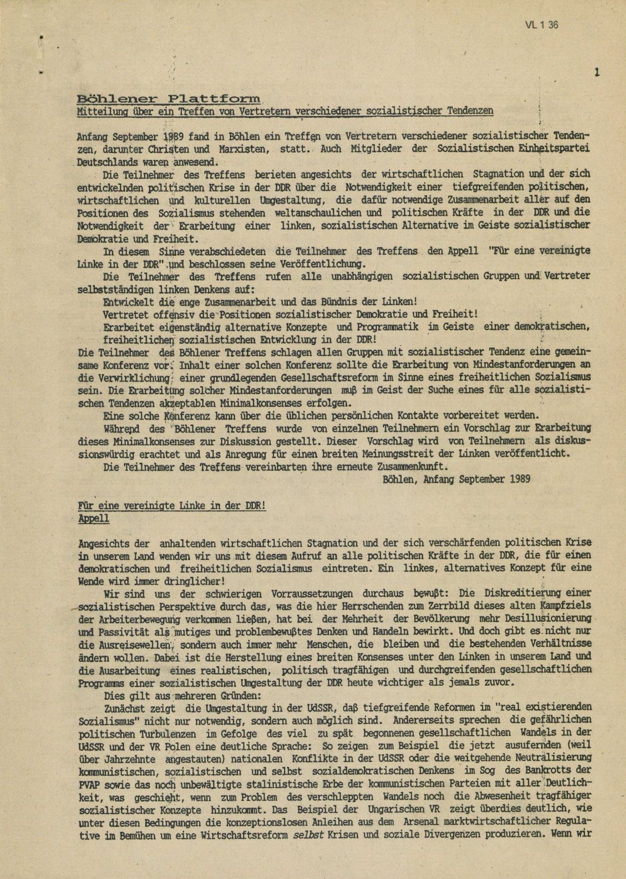 Am 4. September 1989 verabschiedeten sie einen vierseitigen Aufruf unter dem Titel „Für eine vereinigte Linke“, der als „Böhlener Plattform“ bekannt wurde. Sie fordern darin die Erneuerung des Sozialismus auf demokratischer Grundlage unter Beibehaltung des gesellschaftlichen Eigentums an Produktionsmitteln sowie den ökologischen Umbau der Industriegesellschaft.