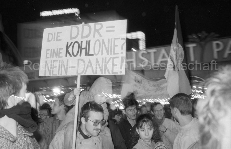 Während Helmut Kohl am 19. Dezember 1989 anlässlich eines Treffens mit Ministerpräsident Hans Modrow in Dresden begeistert von der Bevölkerung empfangen wurde und sich dort für die deutsche Einheit aussprach, fand in Ost-Berlin auf dem Alexanderplatz eine Demonstration gegen die deutsche Einheit statt. 50.000 sprachen sich "für eine souveräne DDR, gegen Wiedervereinigung und einen Ausverkauf des Landes" aus.