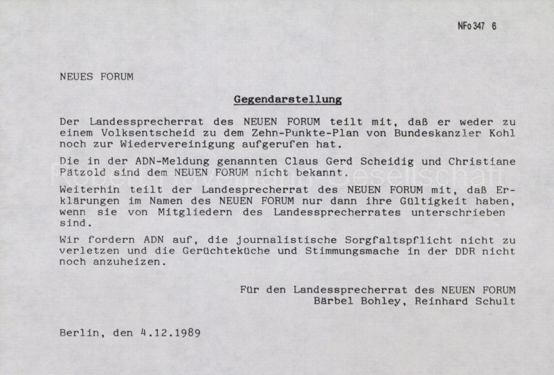 Der Sprecherrat des Neuen Forums veröffentlicht daraufhin eine Gegendarstellung, in der man sich von der Pressemitteilung und den darin erhobenen Forderungen nach einem Volksentscheid über den 10-Punkte-Plan und einer Wiedervereinigung distanziert. Ein Claus Gerd Scheidig und eine Christane Pätzold seien dem Neuen Forum nicht bekannt. Außerdem seien Erklärungen des Neuen Forums nur mit Unterschriften von Mitglieder des Sprecherrates des Neuen Forums gültig.
