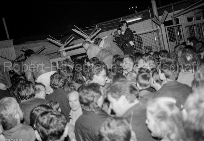 Aus meiner Wohnung holte ich den Fotoapparat und zusammen mit meinem 17-jährigen Sohn ging ich den kurzen Fußweg von unserer Wohnung zum Grenzübergang. Zu diesem Zeitpunkt hatten sich schon viele Menschen vor dem Schlagbaum versammelt. Wir konnten uns langsam durch die Menschenmenge nach vorne drängeln. Vom geschlossenen Grenzzaun aus konnten ich und mein Sohn sehen, dass an der Fußgängerabfertigung bereits erste Menschen nach West-Berlin durchgelassen wurden. Allerdings traute ich mich nicht hier zu fotografieren, denn direkt auf der anderen Seite des Zauns standen uniformierte Grenzsoldaten. Die Menschen um uns herum wurden immer lauter mit Rufen wie „Macht das Tor auf!“ und „Wir kommen wieder!“ Die Stimmung war aber keineswegs wütend oder aggressiv. Eher so, als würden die Menschen selbst nicht an die Erfüllung ihrer Forderungen glauben. Durch die rasant größer werdende Menschenmenge wurden aber auch diese Rufe immer lauter und somit stieg auch der Druck auf die Grenzer.