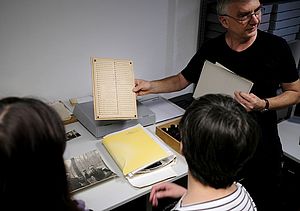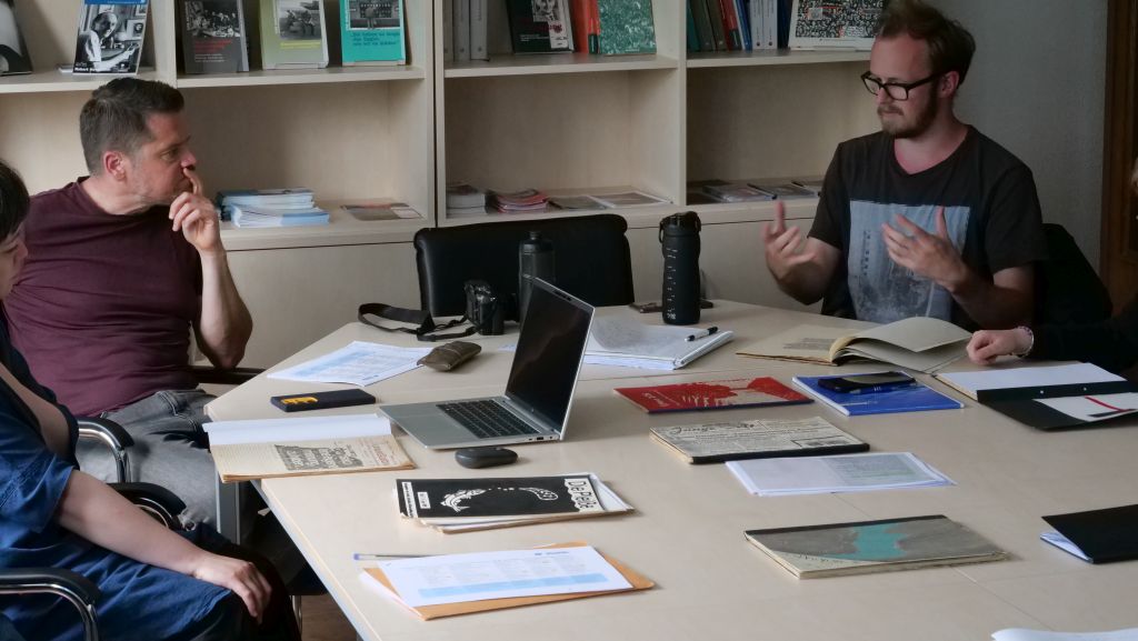 Der zweite Tag stand im Zeichen der theoretischen und praktischen Einführung in die Archivarbeit. Prof. Dr. Susanne Freund und Dr. Kai Ziegner leiteten die Studierenden zunächst in die Grundlagen der Archivarbeit sowie in künstlerische Forschungsmethoden ein. Nach einer Mittagspause wurden den Teilnehmern spezifische Materialien aus den drei Themenkomplexen vorgestellt. In einer anschließenden Arbeitsphase bildeten die Studierenden Gruppen und begannen mit der Recherche zu den eingeladenen Zeitzeugen: Samirah Kenawi, Klaus Ihlau und Karim Saab.
