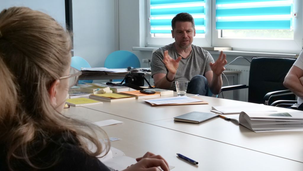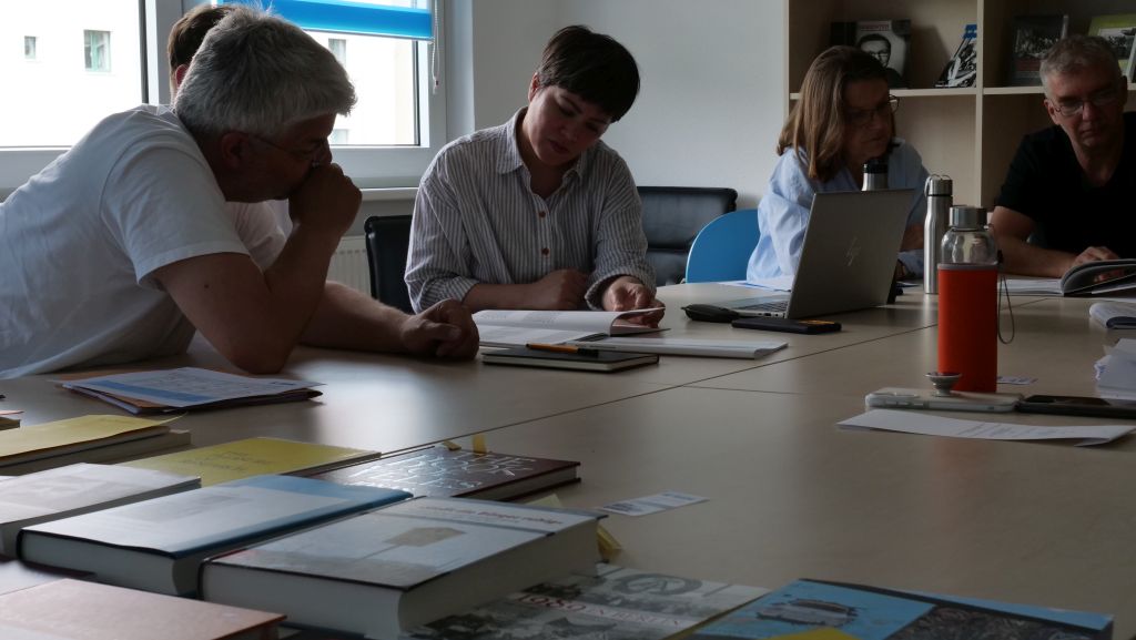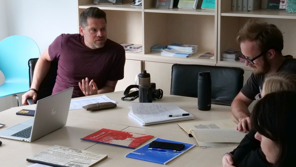 Am dritten Tag lag der Fokus auf der Oral History und künstlerischen Forschungsstrategien. Prof. Dr. Freund und Dr. Ziegner führten die Studierenden in die Methoden der mündlichen Geschichtsschreibung ein, gefolgt von praktische Quellenarbeit mit historischen Archivmaterialien aus dem Archiv der DDR-Opposition. Der Nachmittag war der Vorbereitung der Zeitzeugengespräche gewidmet. Die Studierenden erarbeiteten in Gruppen Gesprächsleitfäden, die sie in den folgenden Tagen anwenden sollten.